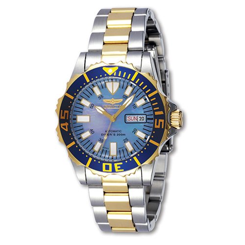 Invicta Men's 2688 Pro Diver Collection Abyss Automatic Watch - It can be a serious diver and still show a little 'style with Invicta Abyss automatic men's two-color (model 2688). His round case in silver stainless steel measuring 44 mm (1.7 inches) and has a blue unidirectional bezel with gold engraved signs and lights scalloped gold. The blue mother of pearl dial with large luminous Tritnite dial and hands with encroaching minute indexes. Additional features include a water resistance to 200 meters (660 feet), day and date display at 3 clock, and a link bracelet band, silver, stainless steel and 23 carat gold plated links.Pro Diver Collection Plunge into any mixed horizon with the steadfast guidance, the Invicta Pro Diver. Stylishly classic, inside a, Invicta Men's 2688 Pro Diver Collection Abyss Automatic Watch.