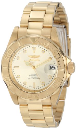 Invicta Men's 9010 Pro Diver Collection Automatic Watch - Invicta gold-tone Pro Diver automatic clock (model 9010) is perfect for the serious diver who also wants to turn heads with a stylish clock. This clock has a distinctive solid stainless steel case in 23 carat gold, the 44 mm wide (1.73 inches), measures covered with a unidirectional rotating bezel serrated. It has. A champagne dial background with luminous Tritnite hands (with seconds hand) and dotted luminous dial markers with small minute indexes The gold-tone stainless steel bracelet band mixes brushed and polished links, is joined by a diver buckle and safety clasp. Other features include a date display at 3 clock and water resistance of up to 200 meters (660 feet). Pro Diver Collection Plunge into any horizon with, Invicta Men's 9010 Pro Diver Collection Automatic Watch.