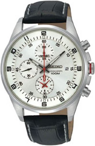 Seiko Men's SNDC87P2 Leather Synthetic Analog with White Dial Watch - Stainless steel measuring 43 mm in diameter by 10 mm thick. Black leather strap with a practical buckle. Classic silver dial has matching hands and hour markers. Date display at the third hour. Chronograph function measures up to twelve hours of activity in 1/20 second increments. A scratch resistant Hardlex crystal protects the precise Quartz movement. Water resistant to 100 meters., Seiko Men's SNDC87P2 Leather Synthetic Analog with White Dial Watch.